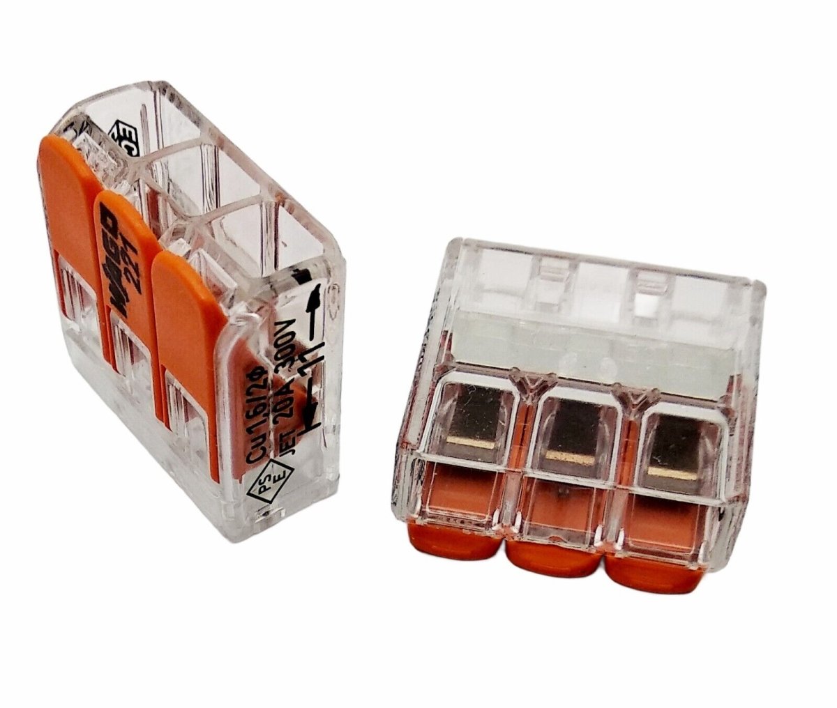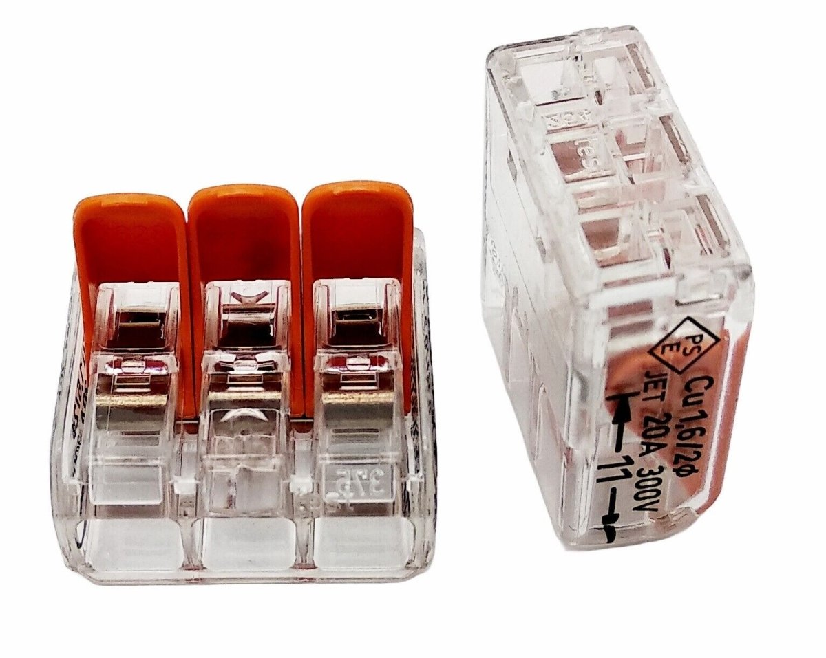 10x kleine Wago 221 Klemmen mit Hebeln, max Kabel Ø 4 mm², 3 Leiter; 450V, 32A